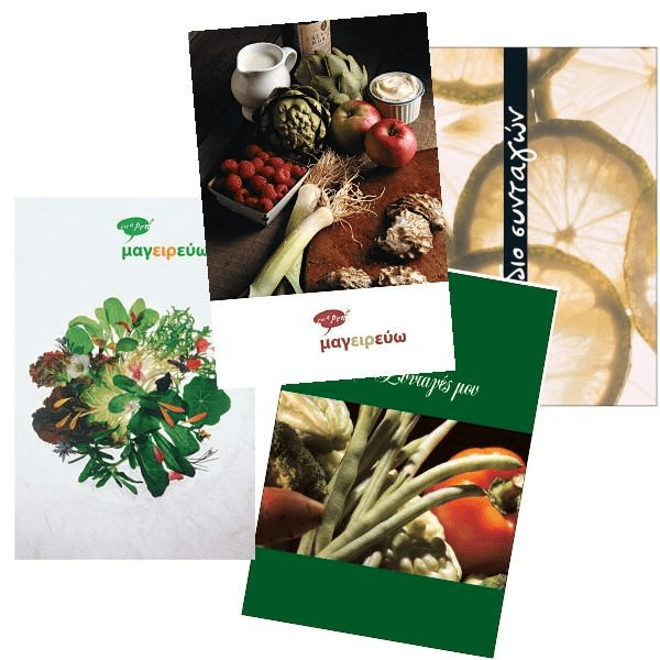 Βιβλιοδετημένο σημειωματάριο για συνταγές μαγειρικής, με διάφορα σχέδια για εξώφυλλο. Από την εταιρεία The Writing Fields