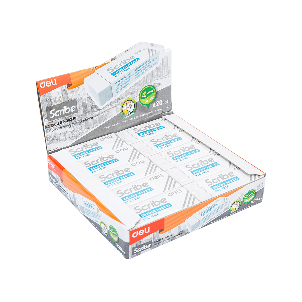 Τα λάθη γίνονται παρελθόν με την λευκή γόμα της Deli από τη συλλογή Scribe. Απαλλαγμένη από PVC ουσίες σβήνει τέλεια όλες τις ατέλειες στα γραπτά ή τις ζωγραφιές σου.