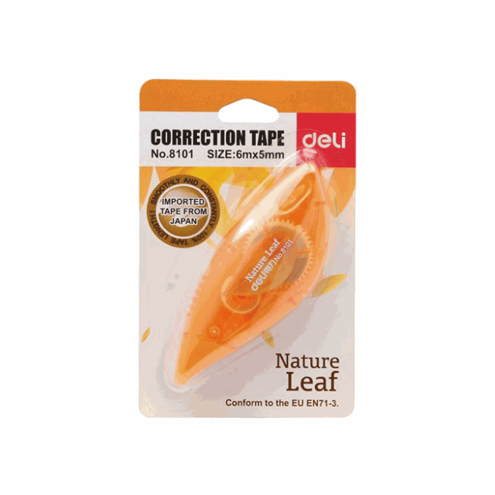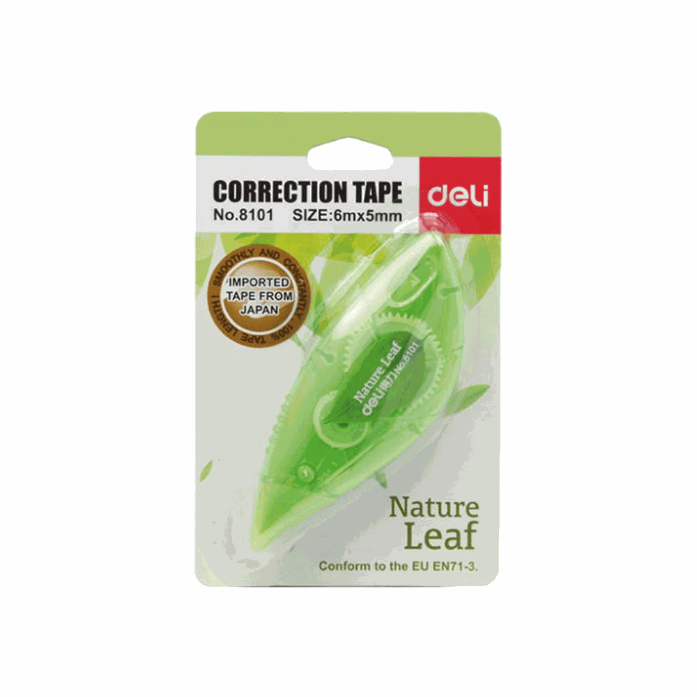 Η διορθωτική ταινία Cover Up Natural Leaf της Deli με μήκος 6m χαρίζει άνετη και ακριβή διόρθωση χάρη στον εργονομικό σχεδιασμό της. Το ημιδιάφανο σώμα της σου επιτρέπει να ελέγχεις με μια ματιά το υπόλοιπο της ταινίας. Έχει πλάτος 5mm για διόρθωση μονής γραμμής με υψηλή καλυπτικότητα. Στεγνώνει αμέσως, για να γράφεις απευθείας. Δεν αφήνει ίχνη και σκιές σε φωτοτυπίες και fax.