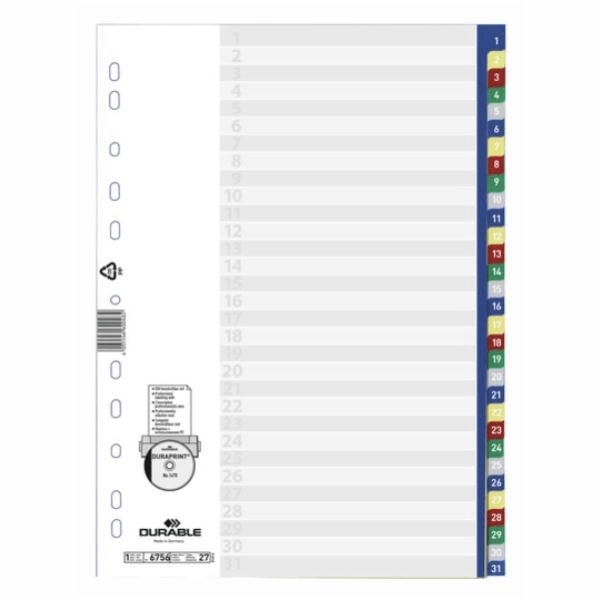 Ευρετήριο πλαστικό χρωματιστό με τους αριθμούς 1-31, σε διάσταση 20×30εκ. για κλασέρ/ντοσιέ. Από την εταιρεία Durable