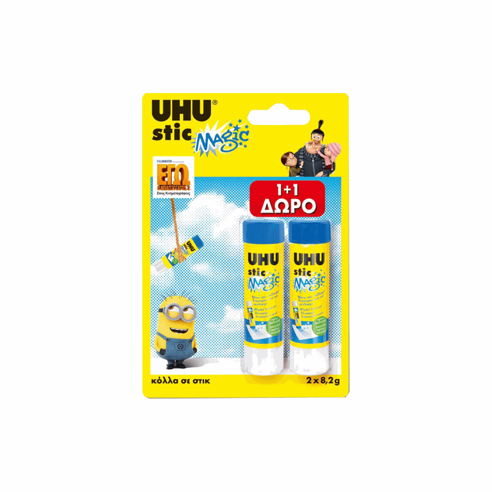 Κόλλα UHU stic magic 8gr. Η κόλλα σε stic που είναι μπλέ όταν απλώνει (για να βλέπετε που κολλάτε) και γίνεται διάφανη μόλις στεγνώσει. Κολλάει αμέσως. Ιδανική για το σπίτι το σχολείο – το γραφείο.Κολλάει χαρτί, χαρτόνι, φελιζόλ, ετικέτες. Ξεπλένεται με κρύο νερό. Χωρίς διαλύτες.