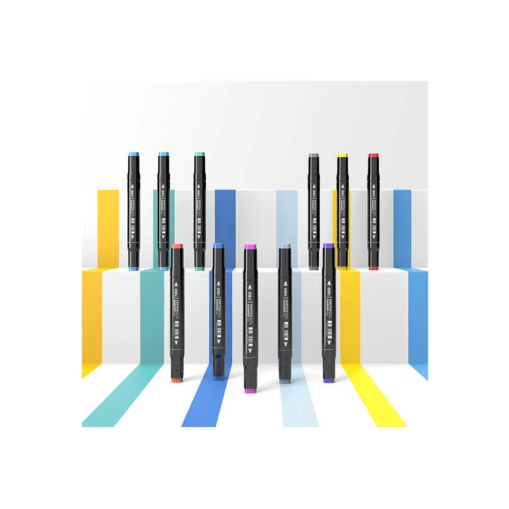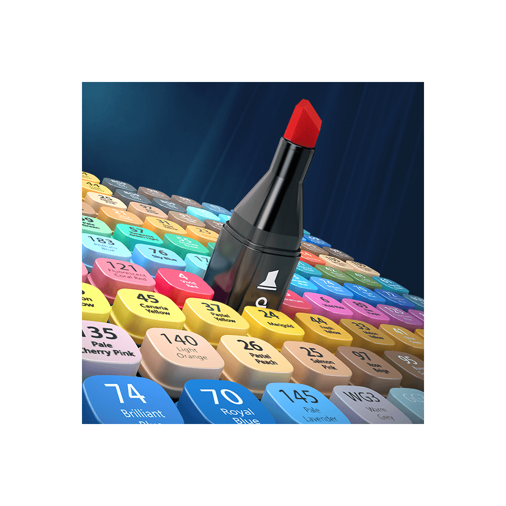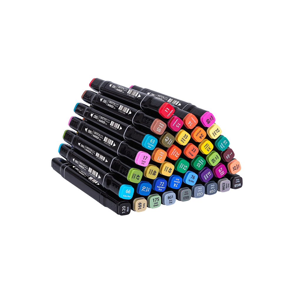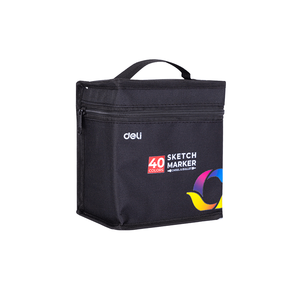 Μαρκαδόροι με βάση το οινόπνευμα για σχέδιο και ζωγραφική με διπλή μύτη (πλακέ και στρογγυλή). Σε υφασμάτινη θήκη και διαστάσεις 1-7mm.