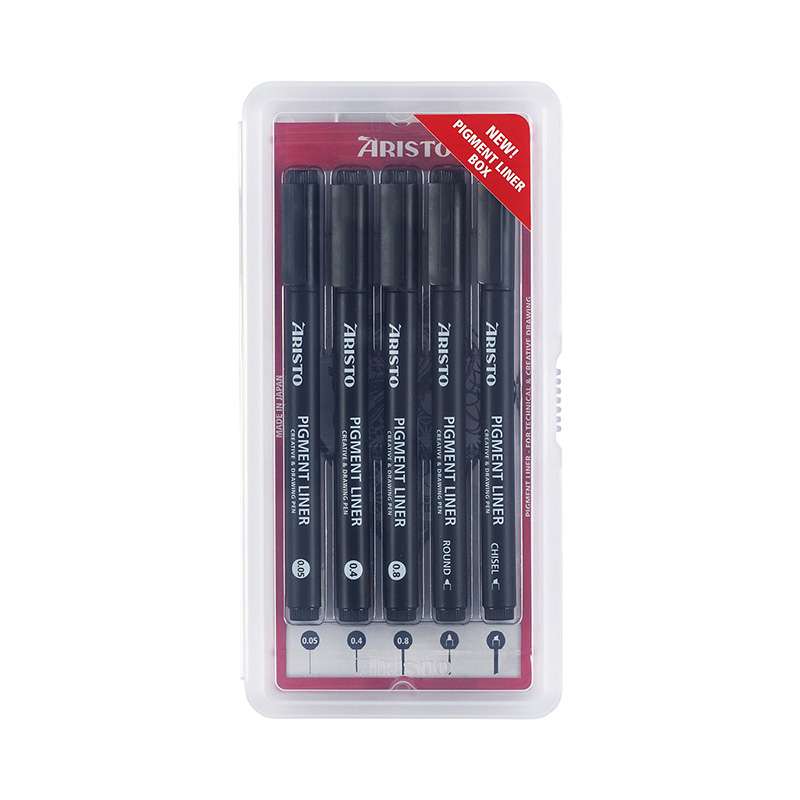 Σετ με μαρκαδόρους pigment 5 τεμαχίων σε μάυρο χρώμα και σε μύτες 0,05 – 0,4 – 0,8 και ακόμα 2 με παχιά στρογγυλή μύτη (round) και λοξή (chisel)
