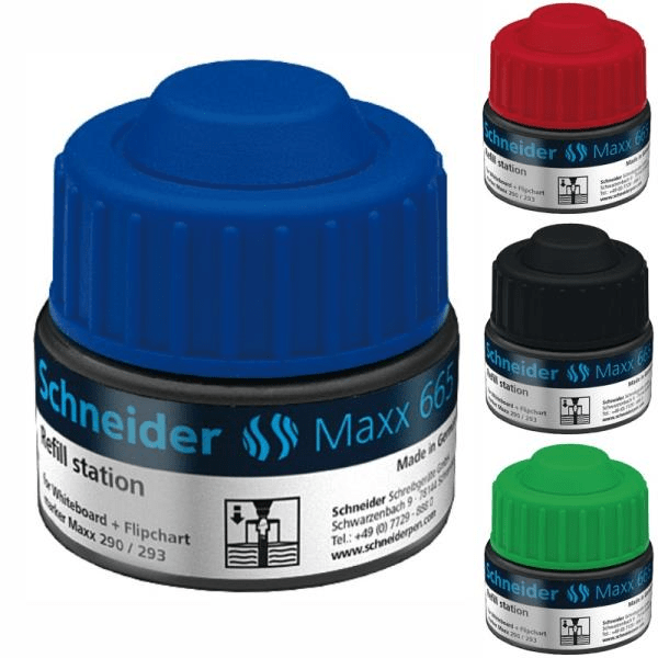 Σταθμός ξαναγεμίσματος για μαρκαδόρους whiteboard και flipchart Schneider Maxx 290 και 293. Περιεχόμενο 30 ml. Απλά τοποθετήστε το δείκτη στο σταθμό και αφήστε τον να γεμίσει αυτόματα. Δεν υπάρχει κίνδυνος υπερπλήρωσης.