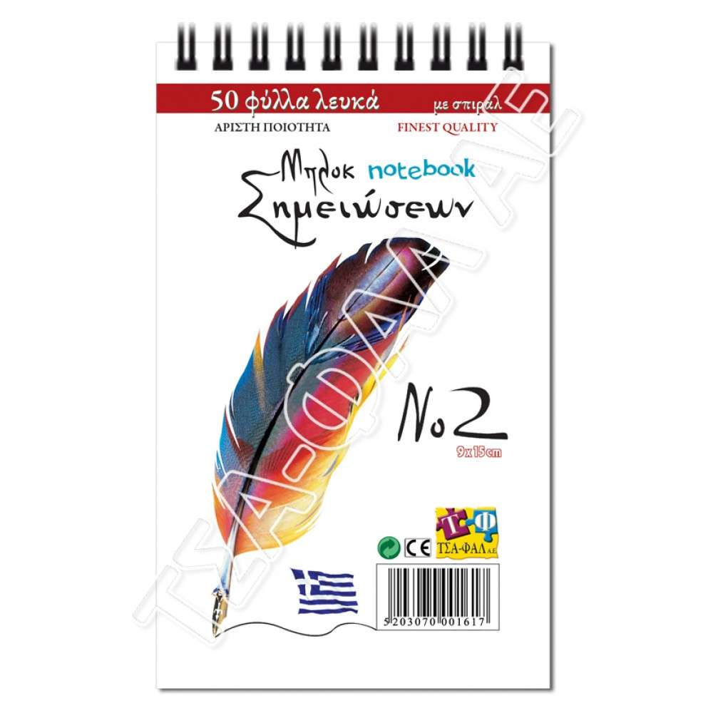 Μπλοκ με σπιράλ, όρθιο με 50 λευκές σελίδες σε διάσταση 9×15εκ, με χαρτί 70γραμμ, ελληνικής παραγωγής. Από την εταιρεία ΤΣΑ-ΦΑΛ