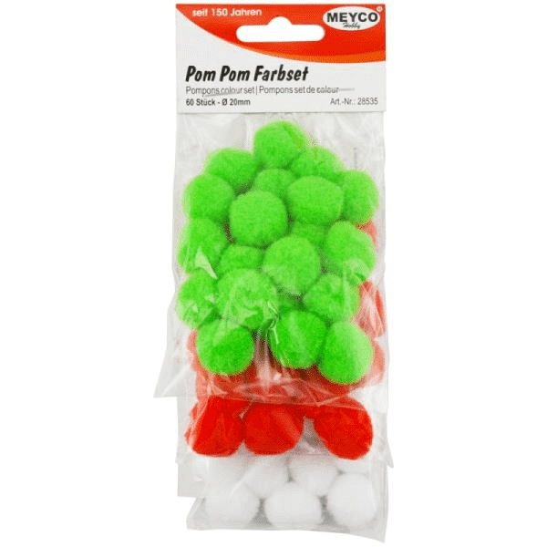 Σετ με 3 συσκευασίες πομ πομ διαφορετικών χρωμάτων (πράσινο, κόκκινο, λευκό). Από την εταιρεία Meyco
