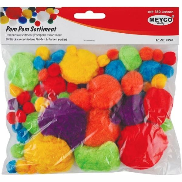 Συσκευασία με 60 πολύχρωμα πομ πομ χειροτεχνίας σε διάφορα μεγέθη και χρώματα. Από την εταιρεία Meyco