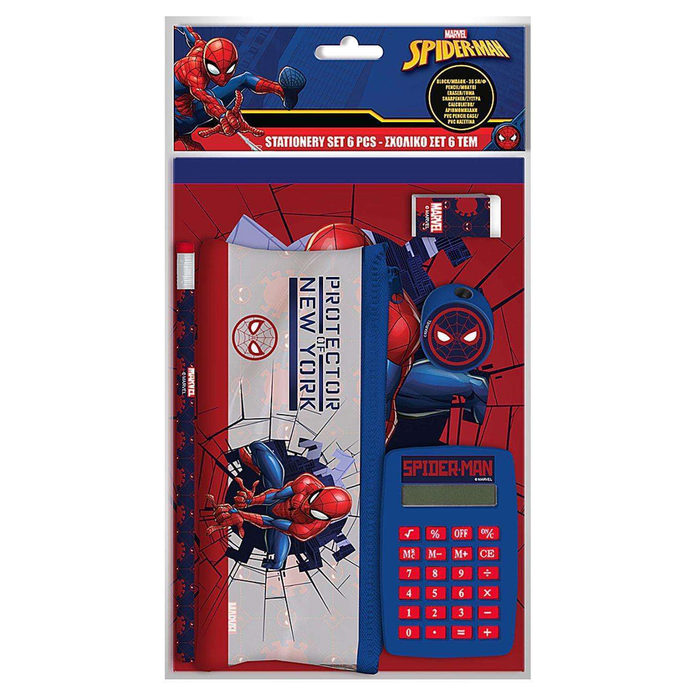 Σχολικό σετ με κασετίνα, μολύβι, γόμα, ξύστρα και αριθμομηχανή. Όλα αυτά σε σχέδιο Spiderman. ΟΕΜ