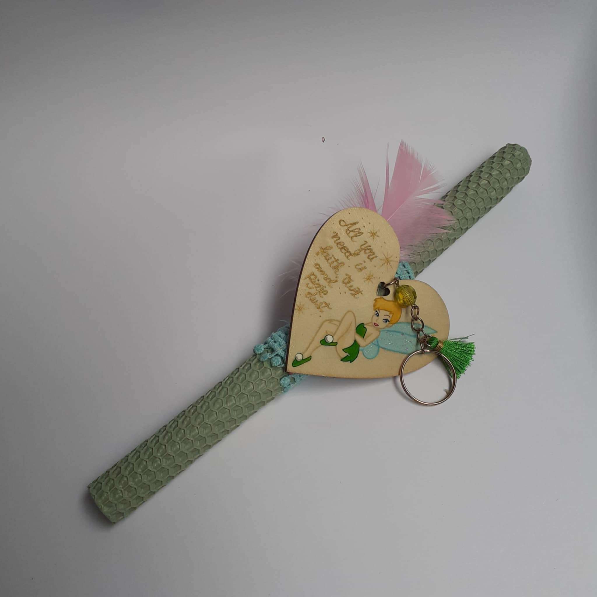 Χειροποίητη λαμπάδα, από φύλλο κηρήθρας, με χειροποίητο επίσης μπρελόκ με την Tinkerbell